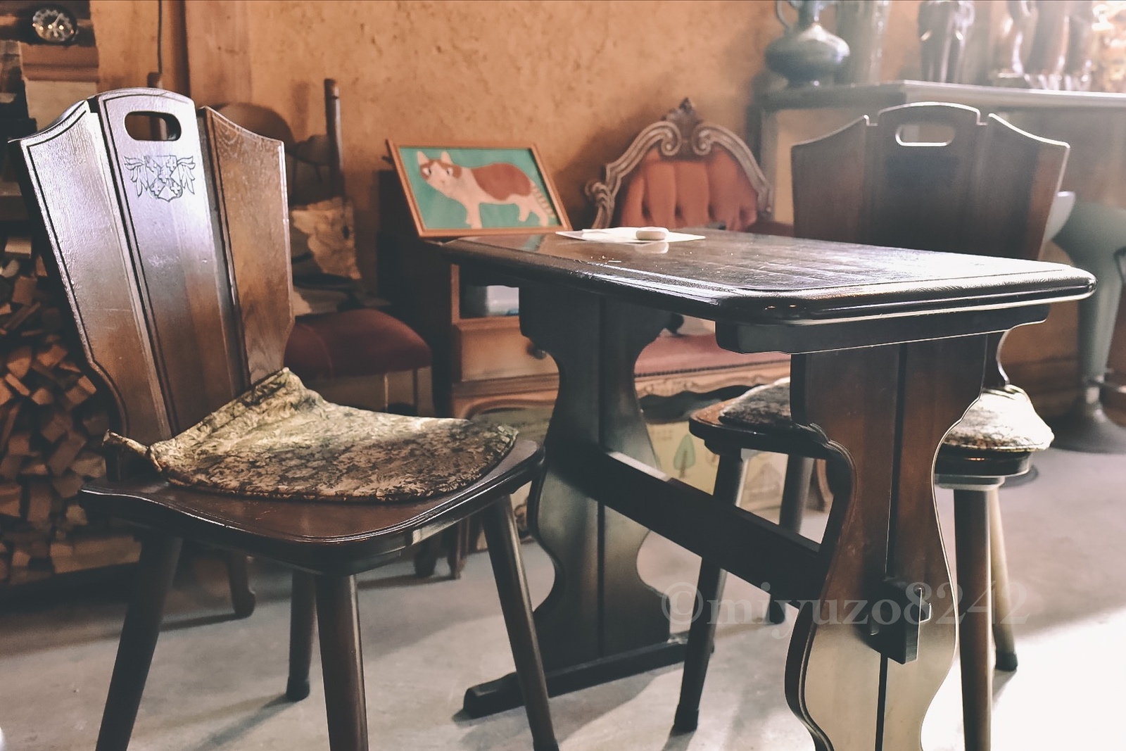 椅子やテーブルを見ても、昔の海外を思わせるような味のあるインテリアが並ぶ。