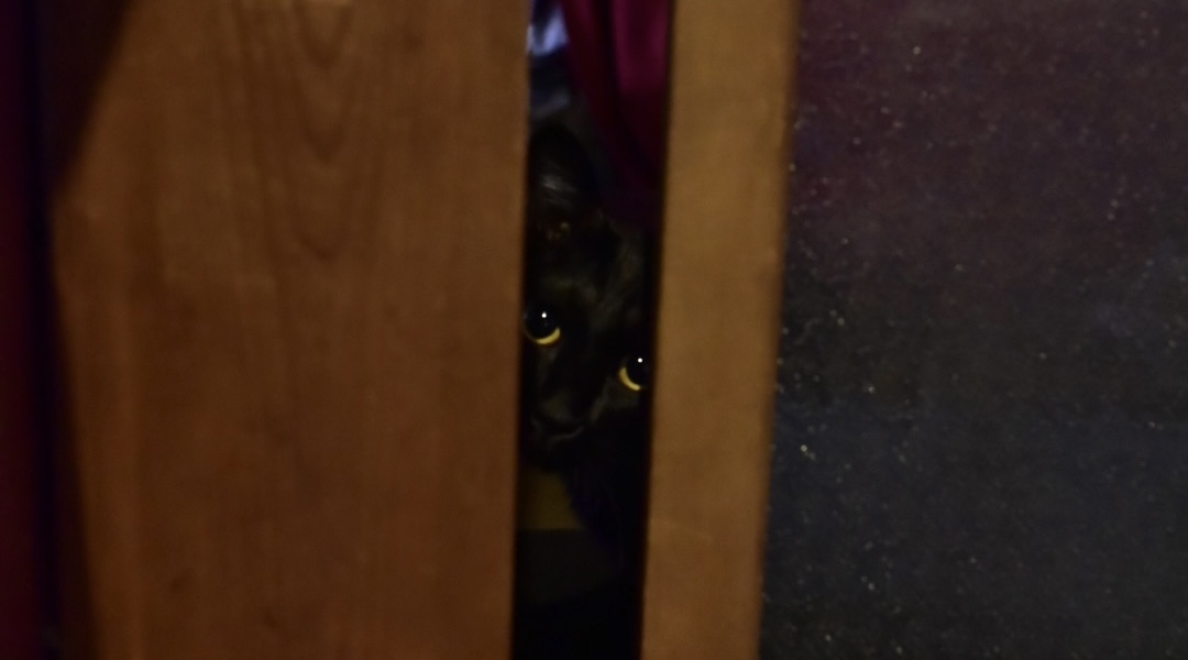 どこから声がするのかと思って探したら、お店の扉の隙間から2つの光る目が覗いてた。笑