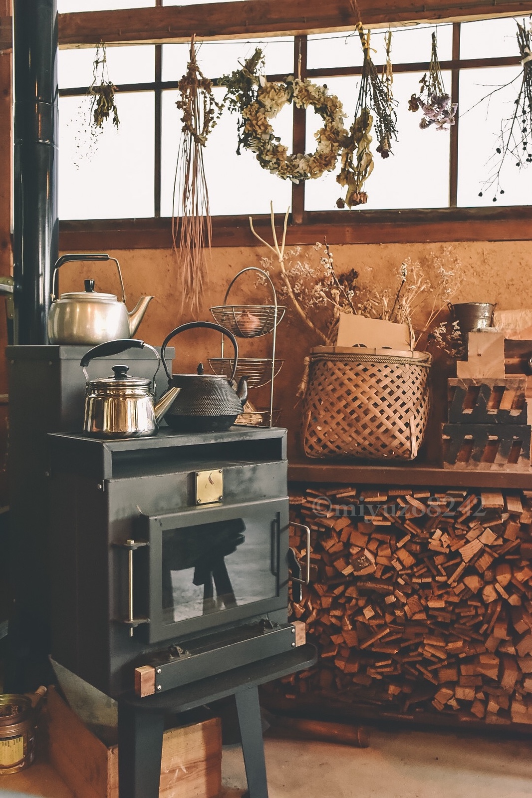 ドライフラワーのガーランドの下には薪とストーブが置いてあってものすごく趣のある雰囲気。