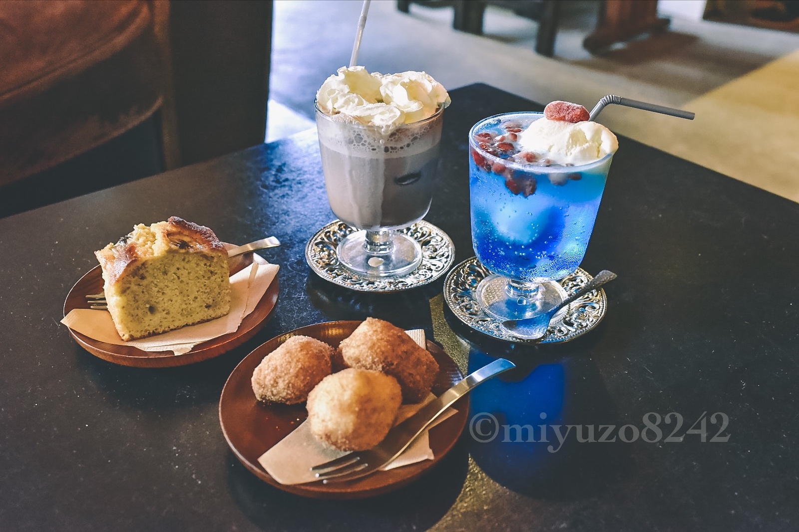 光を浴びてキラキラしてる青いクリームソーダも幻想的✨ドリンクには丸い氷がひとつ浮いてて、そこもお洒落〜🌞