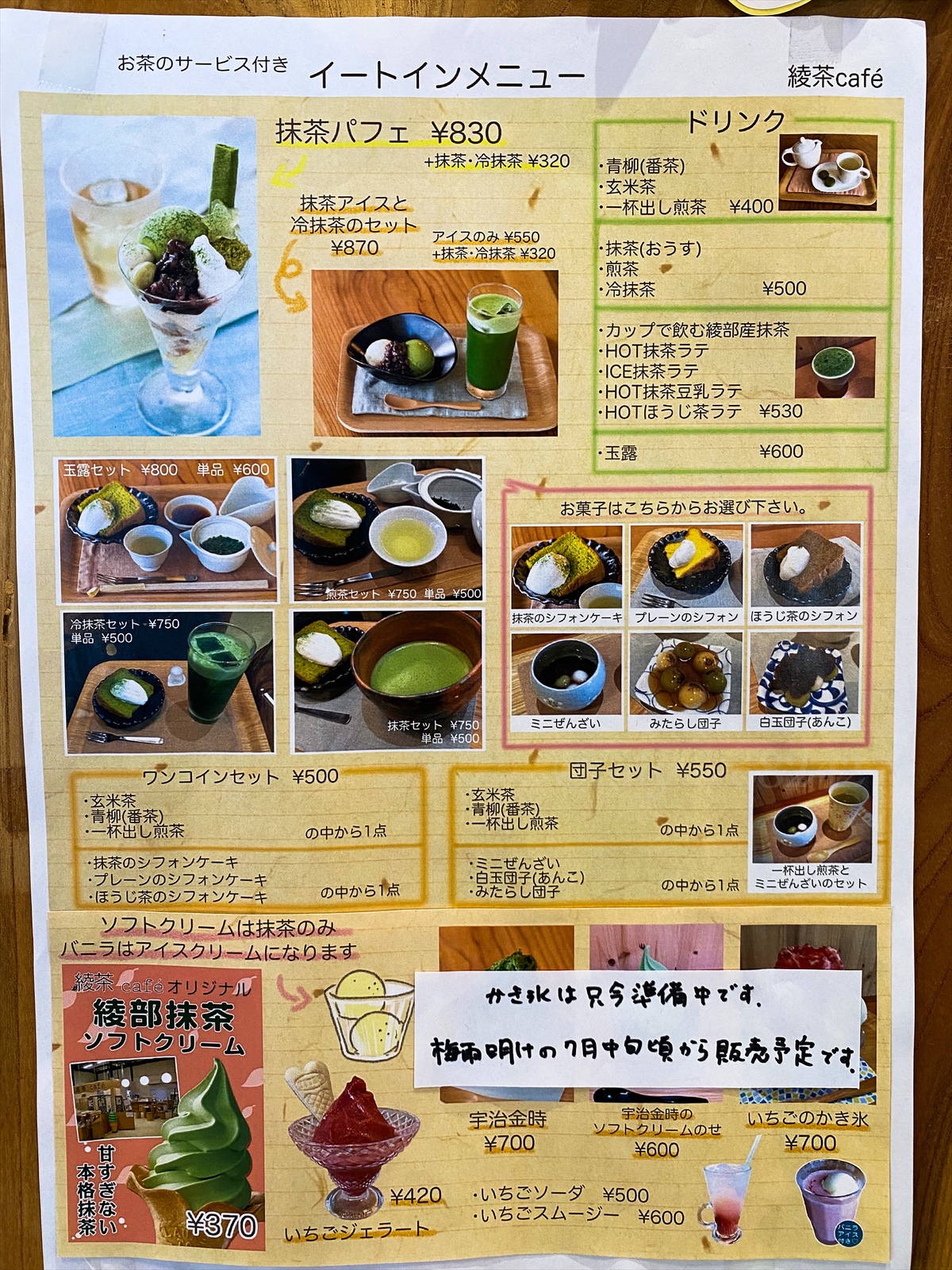 メニューは、玉露・煎茶などの飲み物や、綾部抹茶を使用したスイーツがいっぱい!