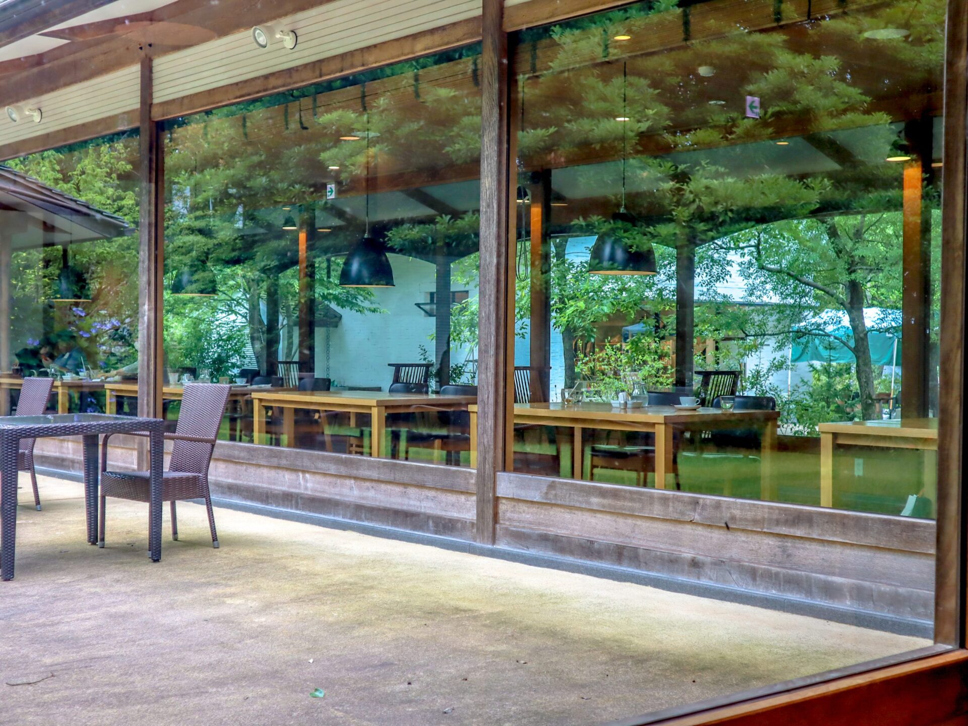 大きなガラス張りの店内からは鮮やかな緑を眺めることができて自然を満喫できる✨
