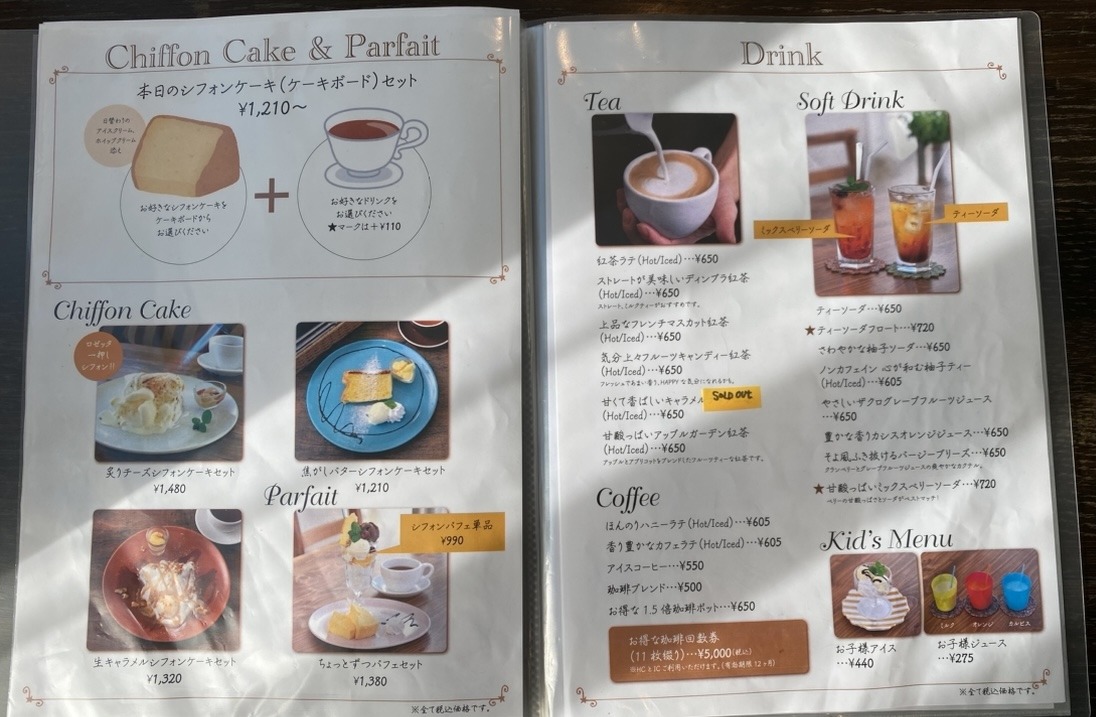 シフォンケーキはテイクアウトもできるけど、店内で食べるならドリンクもついたケーキセットもいただくことができるので、せっかくなら店内で!!