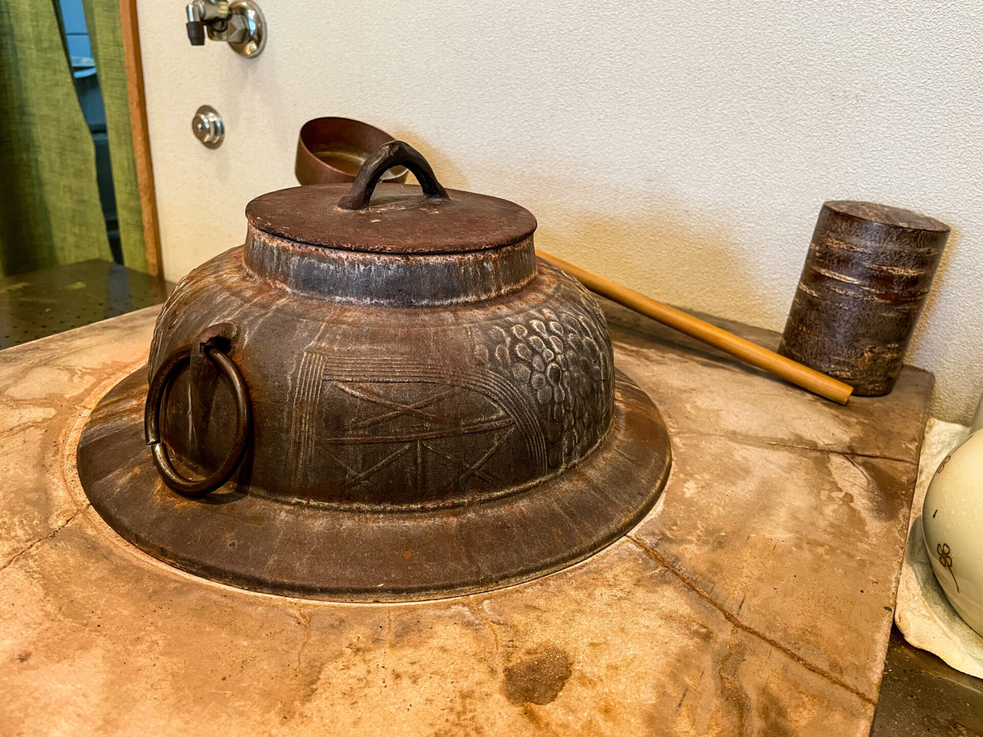 こんな茶釜からお湯をすくってお茶を淹れてくれるんやけど、鉄を含んでて体に良いんだとか!