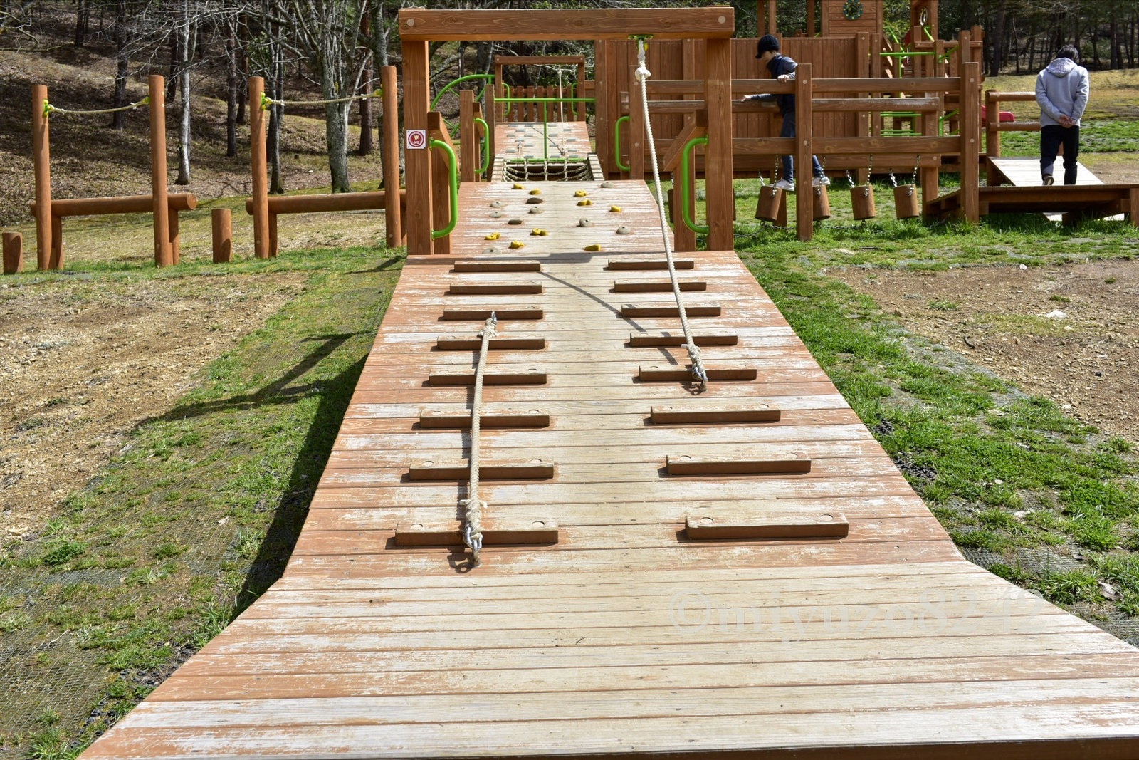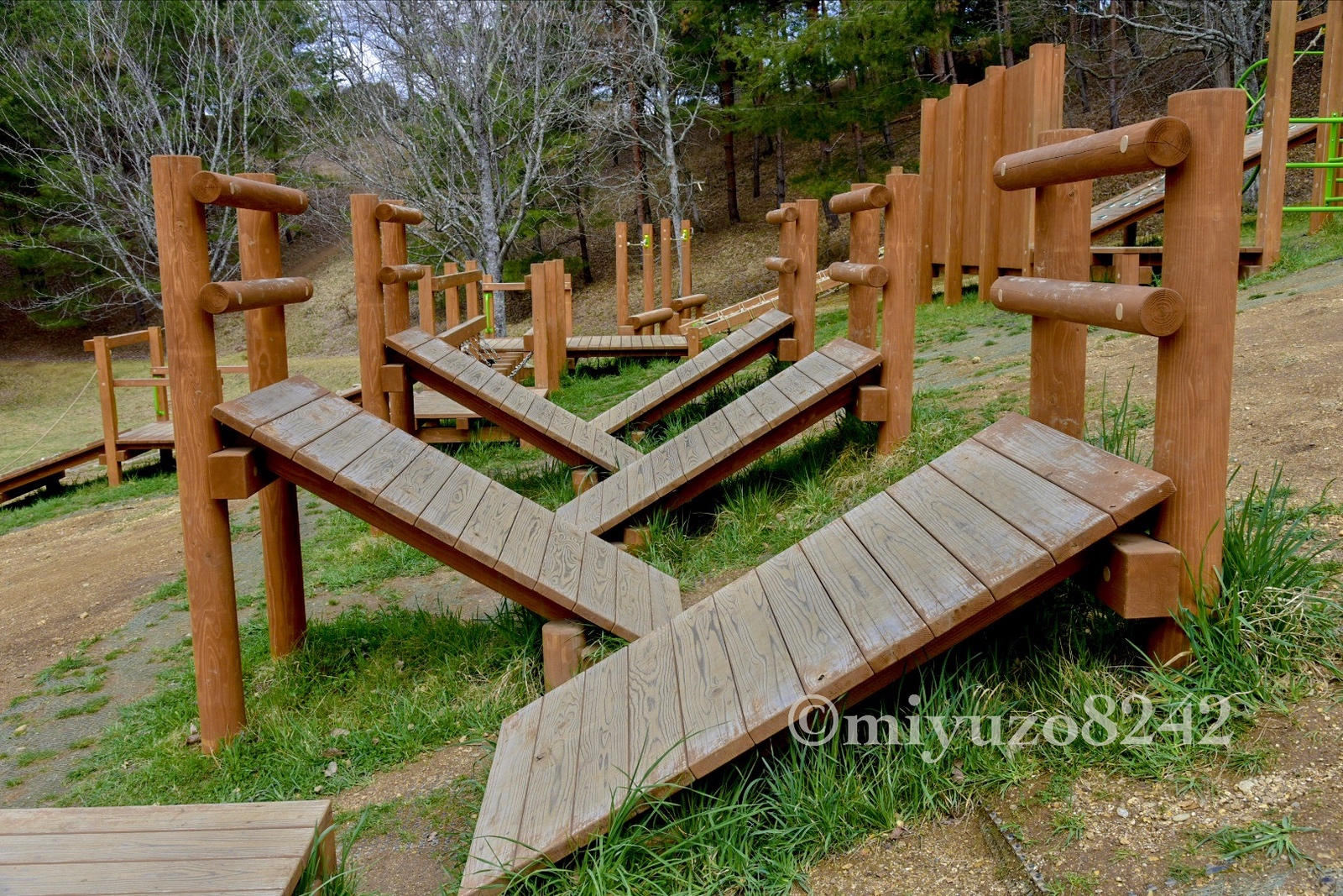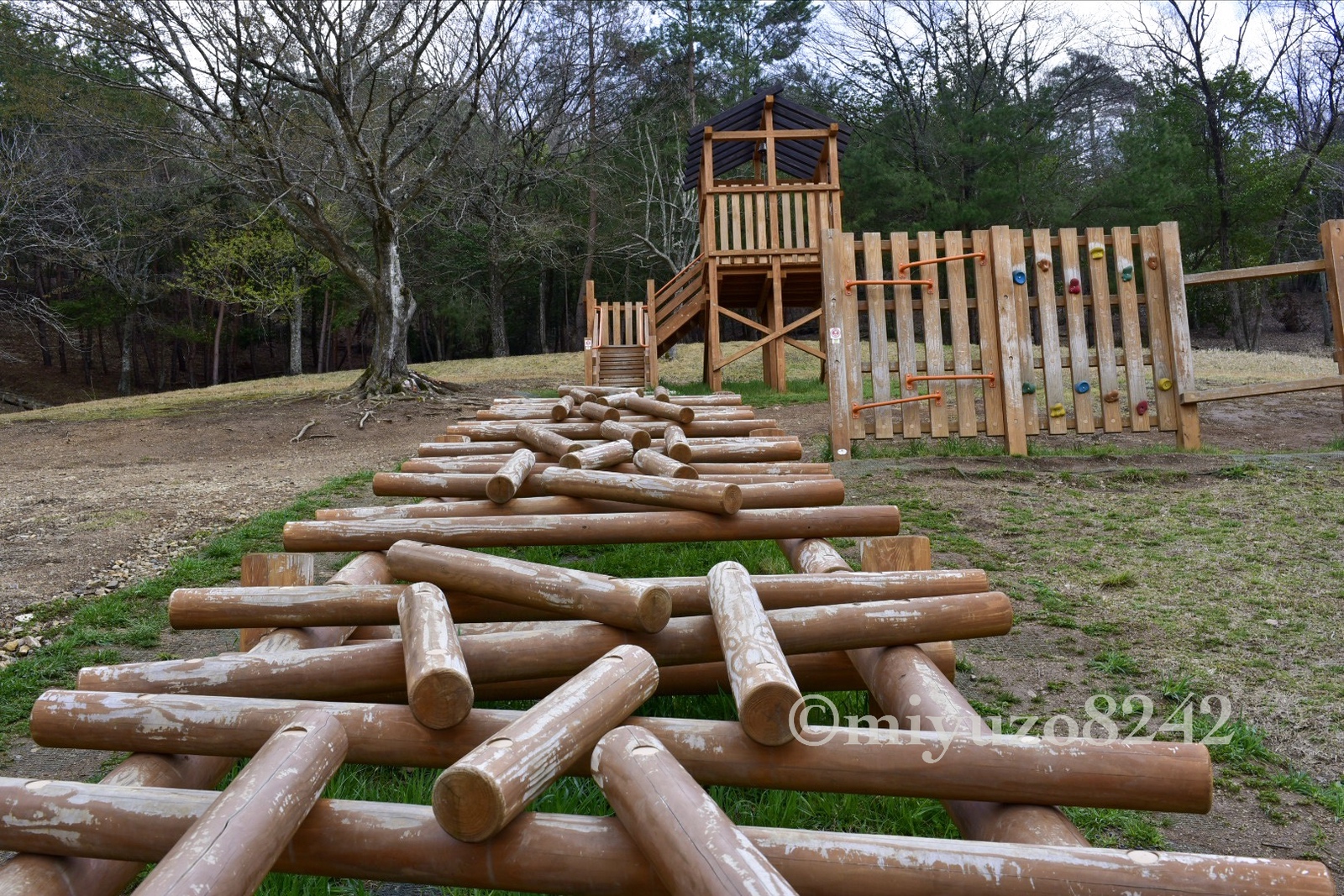 駐車場から徒歩で2.3分くらいでアスレチックパーク!