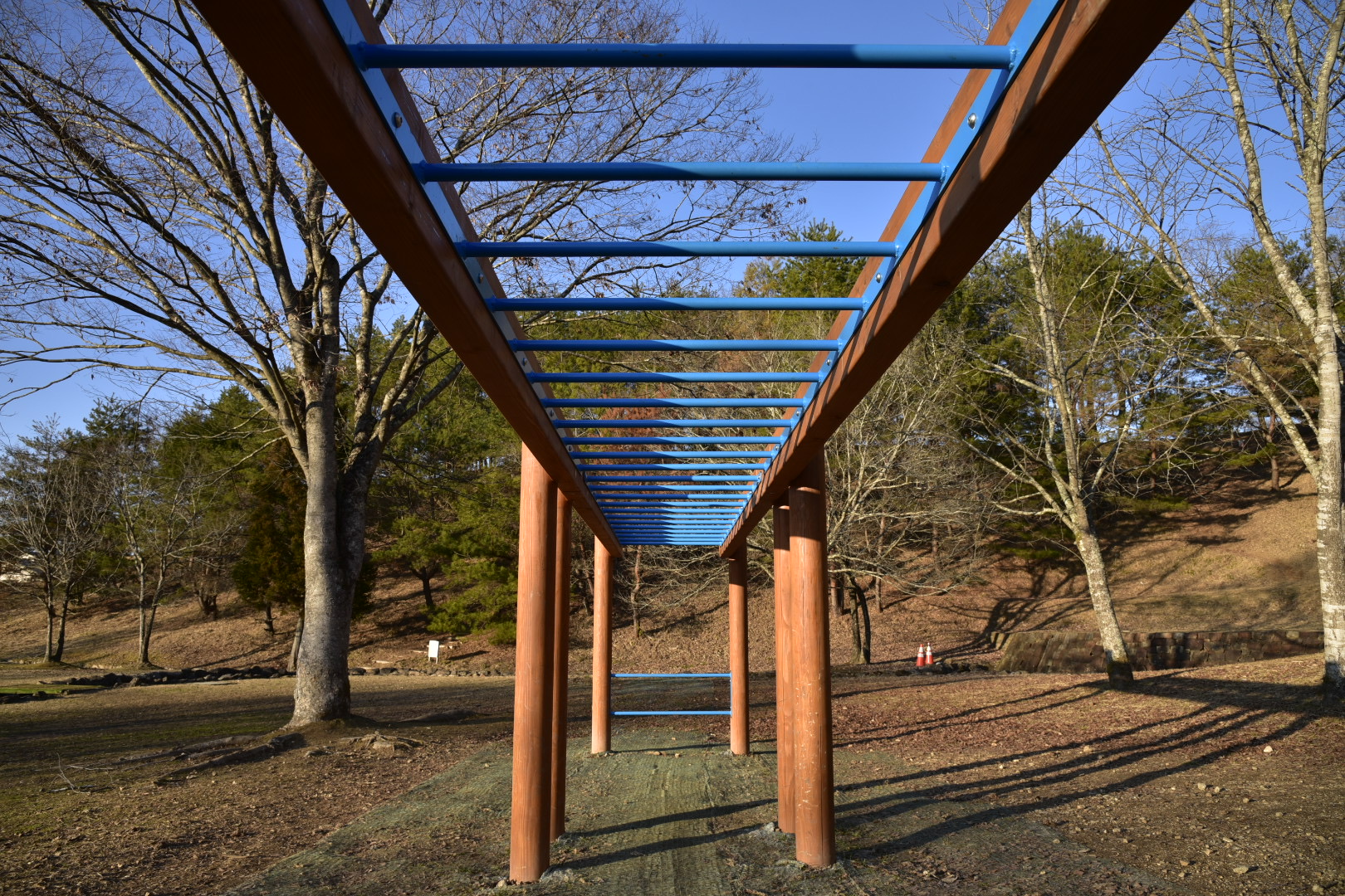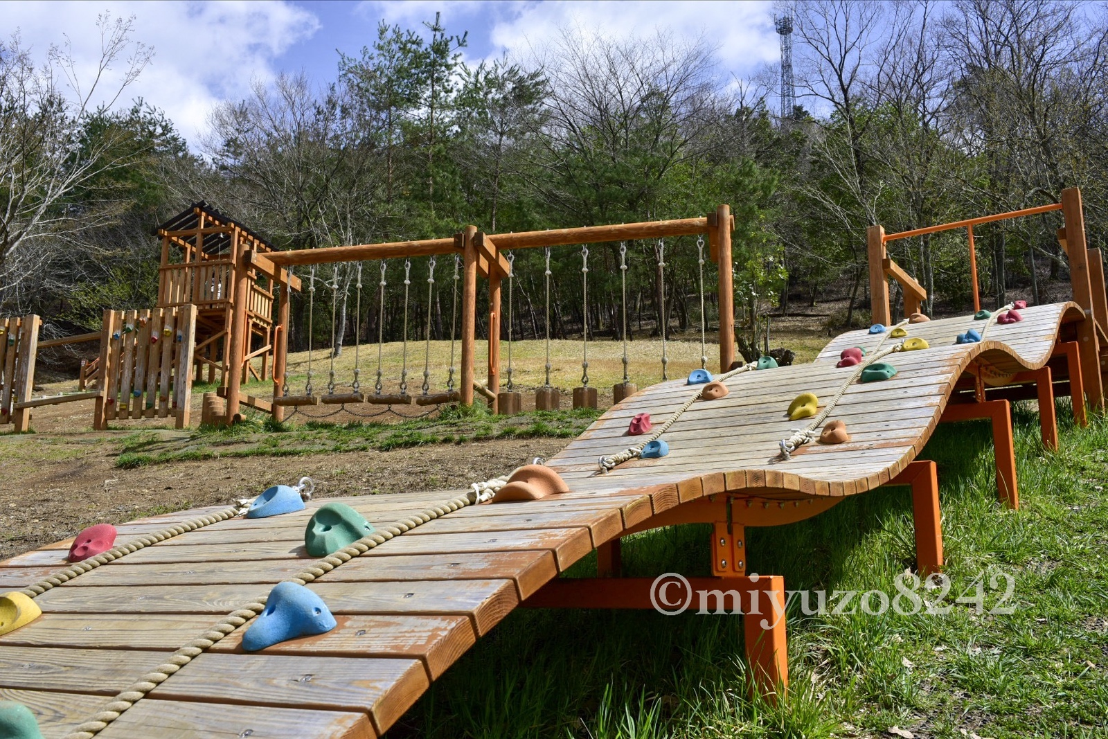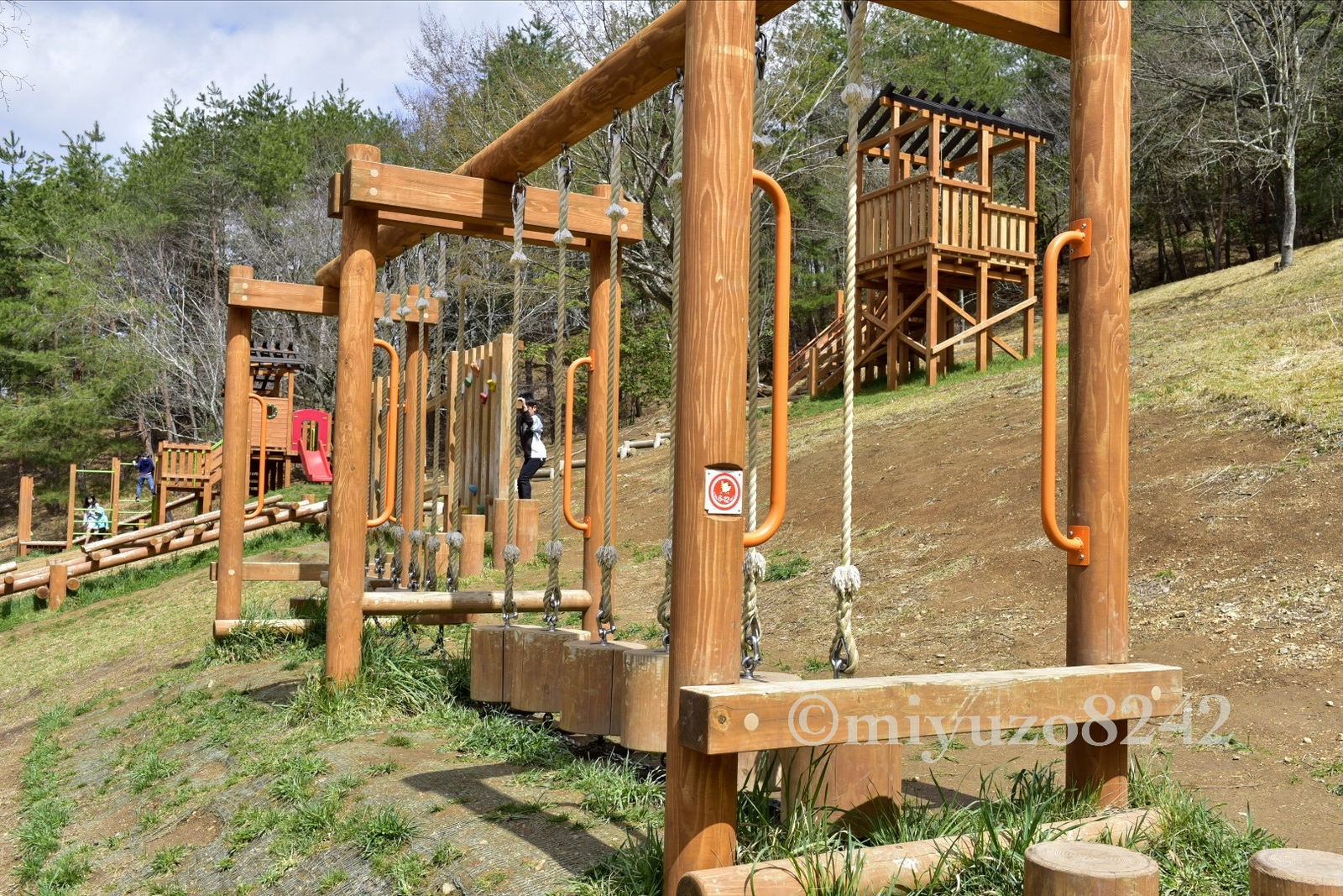 駐車場から徒歩で2.3分くらいでアスレチックパーク!