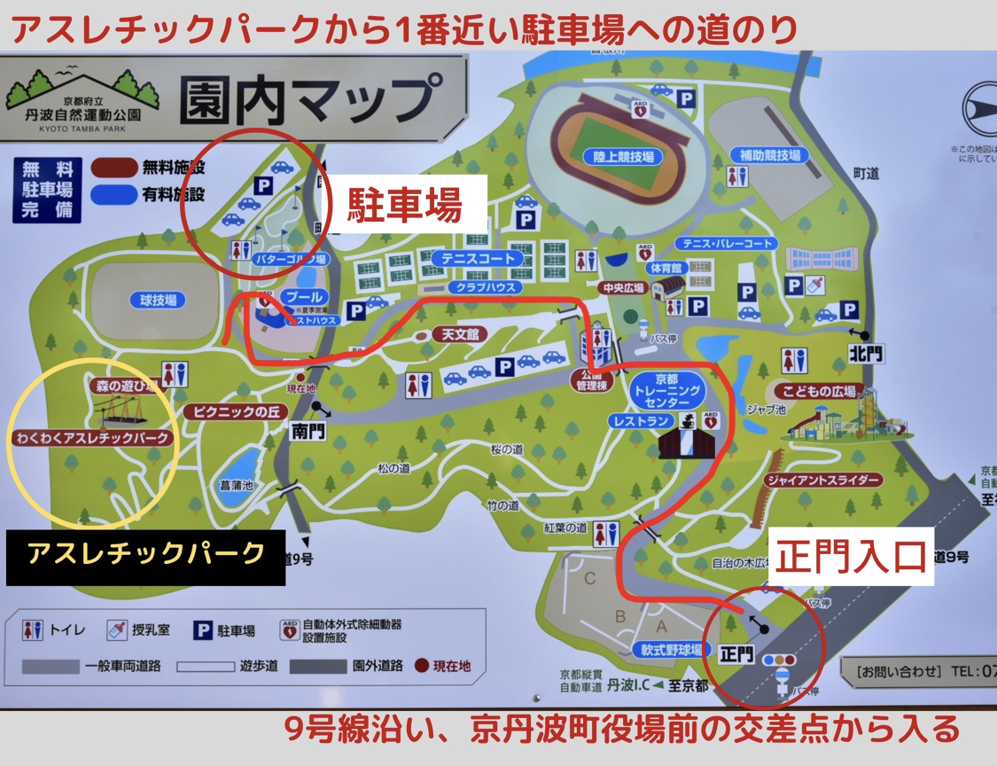 左上の赤丸がアスレチックパークに1番近い駐車場なのでここへ駐車を!