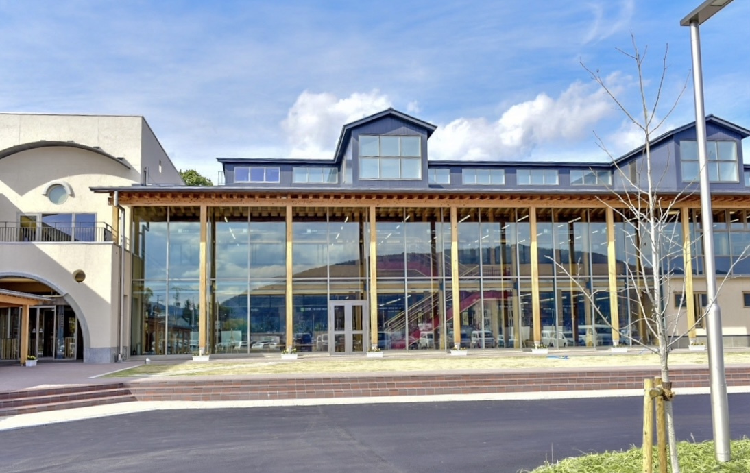 自然公園の向かいにある京丹波町役場は2021年11月1日年に開庁したピカピカの役場。